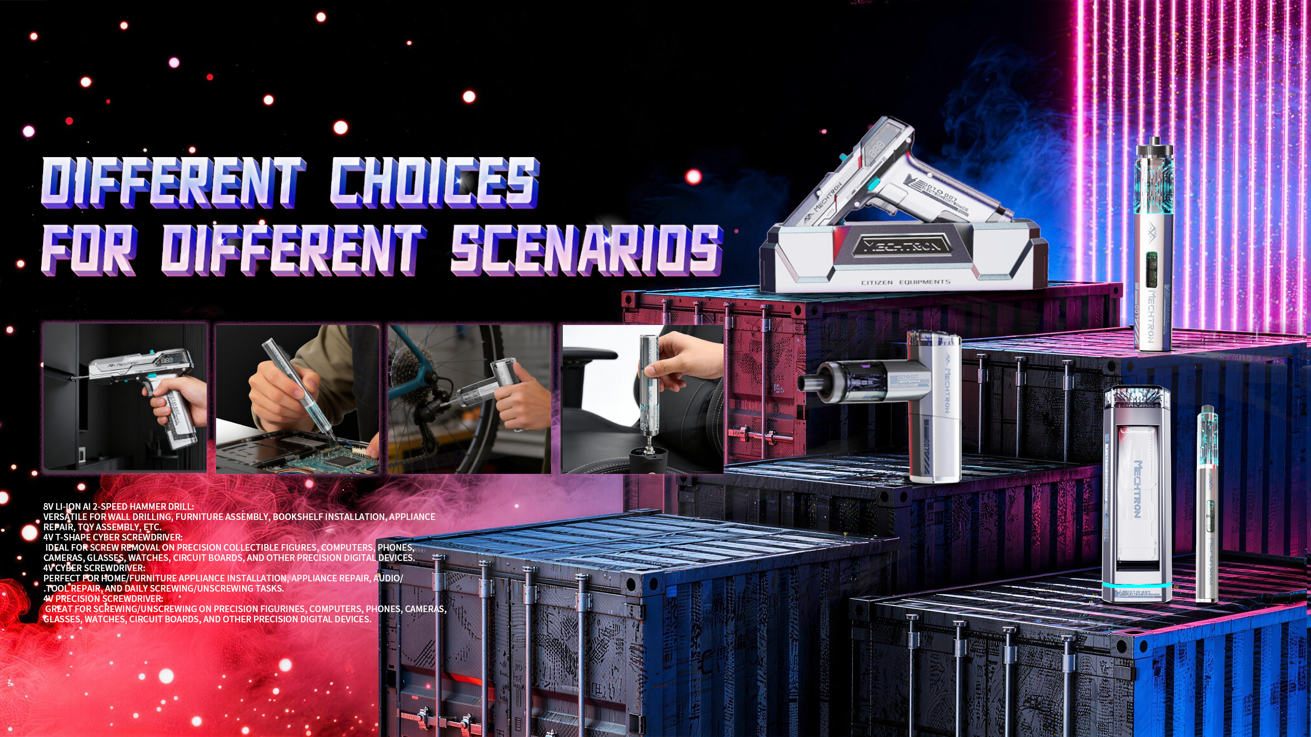 At Mechtron, we specialize in high-quality automotive tools, outdoor gear, home improvement tools, and personal care products designed to make your life easier and more enjoyable. Our tools blend cyberpunk mecha aesthetics with modern functionality, breaking traditional stereotypes to serve as both practical helpers and stylish decor.
